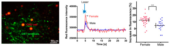 Sniffer CHO cells show that the release of OXT from PVN OXT fibers in the LC is greater in females than males. A representative confocal image showing sniffer CHO cells expressing OXT receptors and the Ca indicator R-GECO1 (red) in close apposition to PVN OXT ChR2-EYFP fibers (green). Scale bar 50 µm (left). A single laser pulse photo-activated ChR2 fibers and increased R-GECO1 fluorescence in neighboring sniffer CHO cells (middle). The responses were significantly greater in females than in males (right). *** p < 0.001.