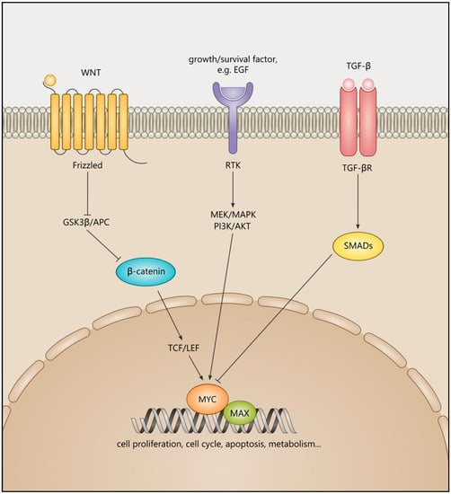 The MYC family of proteins are basic helix-loop-helix leucine zipper (bHLHZip) transcription factors (TFs) under tight transcriptional regulation. The MYC family includes c-MYC (MYC), the first member identified in humans; MYCL; and MYCN [], encoded by c-MYC, L-MYC, and N-MYC (MYCN) genes, respectively []. MYC TFs can be transactivated by forming heterodimers with their partner protein, MAX, which then bind to E-box motifs and, in association with the transcription machinery, trigger the regulation of proliferation, metabolism, differentiation, cell cycle, apoptosis, DNA damage, angiogenesis, protein synthesis, and mitochondrial function [,,]. However, the low specificity of MYC binding to E-box motifs can lead to the activation of alternative pathways and changes to metabolic states [,,]. Furthermore, MYC sits at the crossroads of numerous signalling pathways where it can act as an early response mediator, and precise regulation of MYC expression is critical for maintaining the balance between proliferative and differentiated cellular states []. MYC TFs are downstream of the Wnt signalling pathway and can be aberrantly expressed due to mutations in β-catenin and APC and modulation by non-coding RNAs [,]. MYC expression is also dependent on other signalling pathways, including PI3K/AKT/mTOR, Notch, TGF-β/SMADs, and growth factor-induced pathways [,,]. In Figure 1, we highlighted the roles of Wnt, EGF, and TGF-β signalling pathways in MYC regulation.