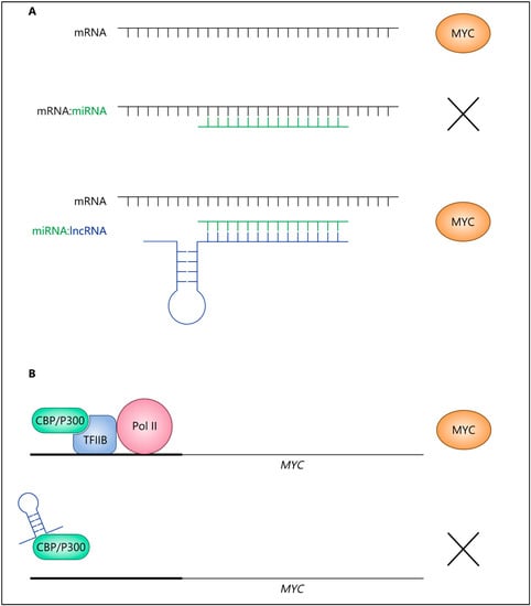 Regulatory loops involving lncRNAs and MYC. (A) A lncRNA (e.g., MALAT1) acting as a competing endogenous RNA by sequestering miRNA (e.g., miR-204), allowing for the production of MYC. (B) The physical interaction between a lncRNA (e.g., linc00261) prevents the recruitment of p300/CBP to the promoter region of MYC, thereby repressing MYC expression.