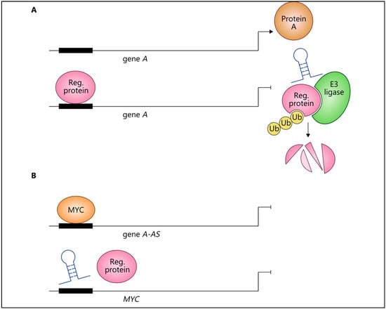 LncRNA-MYC feedback loop mechanisms have been studied in different malignancies with biological and clinical relevance to cancer phenotypes. An interesting example may be metastasis suppressor 1 (MTSS1) and its lncRNA. In pancreatic cancer, the lncRNA MTSS1-AS upregulated its sense gene, metastasis suppressor 1 (MTSS1), by acting as a scaffold/decoy between E3 ubiquitin-protein ligase STIP1 homology and U-box containing protein 1 (STUB1), which earmarks proteins for proteasomal degradation and the transcription regulator myeloid zinc finger 1 (MZF1). MZF1 inhibited MTSS1 expression by binding its promoter (Figure 3A, MTSS1-AS, MTSS1, and MZF1 are lncRNAs encoded by gene A-AS, gene A, and regulatory protein, respectively), and MTSS1-AS-induced ubiquitination-mediated degradation of MZF1 leads to the upregulation of MTSS1 []. Furthermore, extracellular acidity reduced MTSS1-AS levels, thereby stabilising MZF1 and promoting metastasis [].