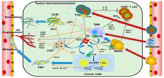 Overview of chemokine (C-C motif) ligand 2 (CCL2) and the tumor microenvironment (TME). (a) Cancer-cell-derived CCL2 acts on regulatory T cells (Tregs), tumor-associated macrophages (TAMs), and myeloid-derived suppressor cells (MDSCs) and recruits these to the TME. (b) Tregs, TAMs, and MDSCs reduce anticancer immunity by suppressing CD8+ lymphocytes. (c) Autocrine, TAM, and cancer-related fibroblast (CAF)-derived CCL2 induces epithelial–mesenchymal transition (EMT) in cancer cells to promote metastasis. (d) Factors from cells that occupy the TME enhance angiogenesis and extracellular matrix (ECM) remodeling, assisting tumor growth and metastasis.