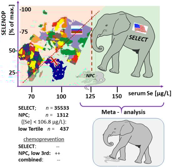 Importance of baseline Se status for the interpretation of RCT results. Dietary intake of Se varies widely in different parts of the world, and large parts of, e.g., the USA, are well supplied. This is in contrast to many other countries. A saturated expression of the Se transporter selenoprotein P (SELENOP, (% of max.)) indicates a sufficiently high Se status and corresponds to serum Se of 120–130 µg/L (broken line). As only one third of participants in the NPC study were below this threshold and showed positive health benefits from supplemental Se, their contribution to the overall effects is diluted and lost in meta-analyses. Positive health effects of supplemental Se can only be expected if selenoprotein expression is affected, and studies performing substitution versus supplementation need to be distinguished.