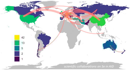The excursion on supplemental Se and well-controlled large RCT may seem of little relevance to Se in AID, while in fact the knowledge and understanding of this background is of central importance for the interpretation of the current database and the general appreciation of Se in health and disease. It is almost impossible not to mention these two contradictory RCT when discussing the perspectives of Se in the ambulant and clinical care of patients. While the large and expensive SELECT study failed to achieve its primary goal of prostate cancer prevention, its scientific quality and technical rigor was undoubtedly of the highest order and provided insights into the human organism’s tolerance to high Se intake. However, its relevance for the risks from Se deficiency and the importance of correcting a pre-existent Se deficit for preserving health and reducing disease risks is marginal. Despite these limits, these particular RCT are constantly referred to when Se supplementation trials are planned, discussed, and neglected, analytical research is considered and then dismissed, or when funding is applied for and then finally denied. The failure of SELECT has not served the basic and clinical research on Se well. A thorough understanding of the reason for failure of this RCT also helps to understand why smaller analytical and intervention studies can still be of profound scientific value, when conducted in populations of low or moderate Se status under high scientific standards. This is another peculiarity for Se in medicine; many important and meaningful studies are conducted in areas with Se deficiency [,], which explains the uneven distribution of collaborations on Se in AID, highlighting in particular central Europe, China, Turkey, and Iran as exceptionally active regions (Figure 2).