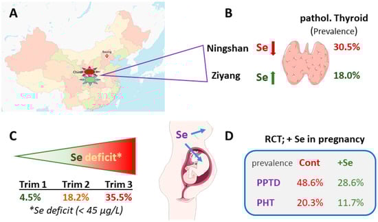 Hashimoto’s thyroiditis (HT) is a highly prevalent, renowned, and dynamic AID, characterized by autoreactive lymphocytes invading the thyroid gland. The immune process causes swelling, initial signs of hyperthyroidism and malaise, followed by a long and often chronic phase of progressive gland destruction, hypothyroidism, and increasing need for thyroid hormone replacement therapy []. The incidence is high and on the rise, exhibits individual disease courses and it is more prevalent in women than in men []. Observational studies in the EU have indicated that Se deficiency is positively associated with thyroid gland volume and nodule formation [,]. Conclusive evidence for a causal role of Se deficiency in promoting hypothyroidism and autoimmune-related thyroid gland damage (i.e., chronic stages of Hashimoto’s thyroiditis) has come from a large cross-sectional study in China enrolling >6000 subjects. The participants were residing either in a Se-deficient area (Ningshan) or in an area with moderate Se status (Ziyang) []. Median plasma Se concentrations differed two-fold (104 vs. 57 μg/L), i.e., from sufficient for a saturated expression of most selenoproteins to a moderate deficiency. Accordingly, thyroid disease prevalence was almost twice as high in the Se-deficient area of Ningshan as compared to Ziyang (Figure 3A,B). The findings highlight that chronic Se-deficiency enhances the risk for AID of the thyroid, despite the notion that the populations were accustomed to their general Se supply []. Summarizing the different observational studies at hand, it becomes apparent that Se deficiency is a risk factor for increased thyroid gland volume, hypothyroidism, HT, thyroid nodules and associated health problems, and a population-wide approach as taken in Finland would likely reduce AID incidence and disease load in many areas of the world. Sex-specific differences in relation to the role of Se in goiter or HT incidence were reported from a large study in Europe [], but were not observed in the large Chinese study []. Baseline iodine supply may modify the interaction of Se and thyroid disease [], as Se status and goiter development are particularly interrelated under iodine deficiency [,]. Besides differences in the dietary Se intake, certain acute conditions are also associated with higher Se demands or increased Se loss, including severe disease, infection, or pregnancy. During pregnancy, increasing amounts of Se are transferred from the mother to the growing fetus, leading to an increasing deterioration of the pregnant woman’s Se status if the increased need is not counteracted by additional Se intake [,]. The deficit may even worsen thereafter due to lactation (Figure 3C), potentially eliciting negative health effects on both the child and mother under limiting Se supply []. After pregnancy, postpartum thyroid disease (PPTD) constitutes a frequently found AID [], in particular for women with positive thyroid autoantibodies (aAb). In view of the developing Se deficit in pregnancy, a highly interesting and instructive RCT from Italy tested supplemental Se to prevent PPTD and permanent hypothyroidism (PHT) []. To this end, pregnant women with or without positive TPO-aAb were enrolled and monitored. The intervention was conducted with 200 µg of selenomethionine per day, and it was successful []. The incidence of both PPTD and PHT was reduced by almost twofold, and no side effects were noted (Figure 3D).