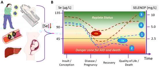 Among the major modifiers of this process are the baseline Se status, before and during the early stages of disease, the severity, and course of the condition that is causing the Se decline along with the minimal Se concentrations that are reached during the disease. Supportive adjuvant therapy including supplemental Se will counteract the drop into the dangerous zone of severe Se deficiency (Figure 4B). Besides potentially triggering AID development, a severe Se deficit has been identified as mortality risk factor in severe illness, e.g., sepsis, COVID-19, liver disease, along with other critical conditions [,,,]. Notably, a sufficiently high baseline Se status is capable of preventing an uncontrolled and exaggerated immune response [,], with some sex-specific characteristics [,], and high potential in the prevention of severe COVID-19 []. The principle of positively affecting the immune system and decreasing inflammation by Se has just been verified in COVID-19 with patients displaying severe acute respiratory distress syndrome, where early supplementation was capable of restoring Se status [].