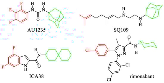 Structure of the MmpL3 inhibitors used to build the pharmacophoric model. The tri-fluorophenyl moiety of AU1235, the difluorophenyl moiety of ICA38, the terminal alkenyl edge of SQ109, and the 5-chlorophenyl moiety of rimonabant are represented in red. The adamantyl moiety of both AU1235 and SQ109, the spiro-undecane moiety of ICA38, and the piperidine ring of rimonabant are represented in green.