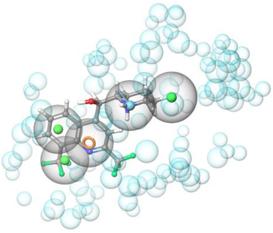 Graphical representation of mefloquine superimposed to the pharmacophoric model. The hydrophobic features (green spheres) are matched by the trifluoromethylphenyl moiety (the most important molecular portions of the mefloquine structure are highlighted in Figure S1) and the alkyl portion of the piperidine ring, the aromatic ring feature (orange circle) is mapped by the pyridine core, and the hydrogen bond donor group (cyan sphere) is represented by the basic piperidine nitrogen atom. Excluded volumes (light cyan spheres of variable size) are also displayed.