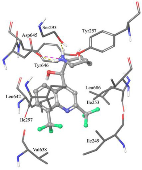 Graphical representation of the interaction pattern of the best-docked pose of mefloquine within the MmpL3 binding site. Extended hydrophobic contacts involve both the trifluoromethyl substituents and the quinoline core. The piperidine basic nitrogen atom makes a hydrogen bond with the Ser293 side chains, and a charge-reinforced hydrogen bond with the carboxyl edge of Asp645. Amino acids are represented by sticks (atom type notation), while mefloquine is represented by a ball and stick (atom type notation). Yellow dashed lines codify for hydrogen bonds, while the magenta dashed line represents a charge-reinforced hydrogen bond.