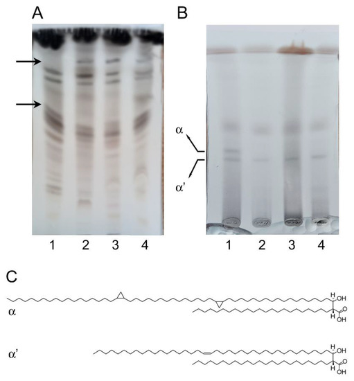 Furthermore, mycolic acids were also extracted from delipidated bacteria to observe the possible impact on arabinogalactan (AG) mycolylation. The presence of both compounds led to a very significant decrease in α-mycolates (Figure 5B), as also visible in the positive control sample (lane 2). The decrease we observed could be due to the block of TMM transport that could indirectly perturb AG mycolylation in all the treated samples.