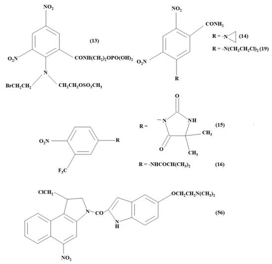 | Nitrofurans, nitrothiophenes, nitropyrroles and nitropyrazoles with alkyl-N-aziridine or alkyloxirane side chains, V79–379A cells [251,252,253] | Alkylating side chains increase the cytotoxicity, the relationship between E17 and cytotoxicity is absent |