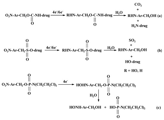 - Tercel, M.; Wilson, W.R.; Anderson, R.F.; Denny, W.A. Hypoxia-selective antitumor agents. 12. Nitrobenzyl quaternary salts as bioreductive prodrug of the alkylating agent mechlorethamine. J. Med. Chem. 1996, 39, 1084–1094. [Google Scholar] [CrossRef]
