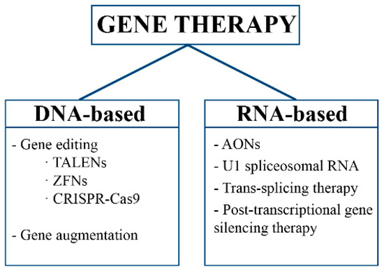 Numerous diseases find their roots at the genetic level. The human genome project and the latest advances in molecular genetics and high throughput techniques allowed us to understand the genetic basis of many pathologies and, thus, to identify new therapeutic targets [1,2]. Therefore, new strategies are being developed for “undruggable” diseases [3]. In the past few decades, gene therapy emerged as a potential treatment for a wide range of diseases, including cancer, cardiovascular and neurological diseases [4]. However, due to the diseases and genetic defects’ heterogeneity, different molecular approaches have been developed to achieve the therapeutic goal.