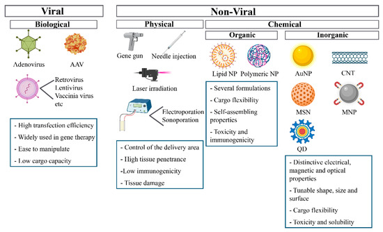 Representation of viral and non-viral delivery systems. AAV: adeno-associated virus. NP: nanoparticle. AuNP: gold nanoparticle. CNT: carbon nanotube. MNP: magnetic nanoparticle. MSN: mesoporous silica nanoparticle. QD: quantum dot.