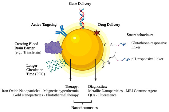 Nowadays, nanotechnology-based delivery systems are starting to be commonly used for gene therapy. One of the main advantages is their incredible versatility. Because of their high surface to volume ratio, nanoparticle surfaces can be functionalized with multiple moieties that allow them to be carriers of gene therapeutics and encompass other capabilities (Figure 4). For example, grafting specific ligands to the nanoparticle’s surface, such as transferrin, may allow them to cross the blood–brain barrier and deliver gene therapeutics to the central nervous system, which currently presents a significant challenge. This versatility allows nanoparticles to be used for various applications, such as in cancer treatment [118].