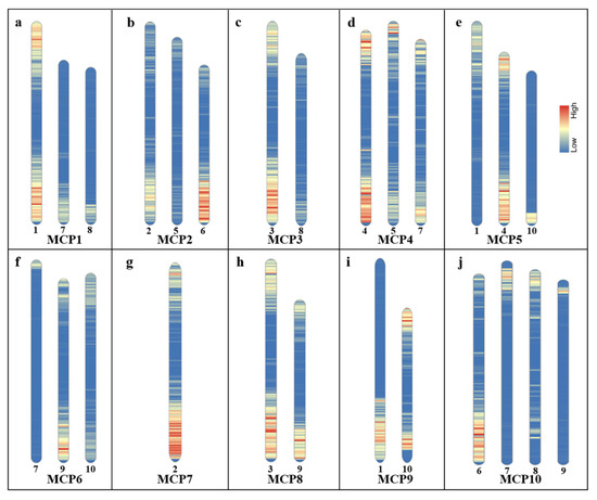 Maize CP sequences’ distribution on sorghum chromosomes. Arabic numerals indicate the chromosome of sorghum; (a–j) indicate the MCP1-10 sequence distributions on sorghum chromosomes in each 500 kb window, respectively.