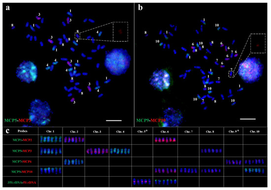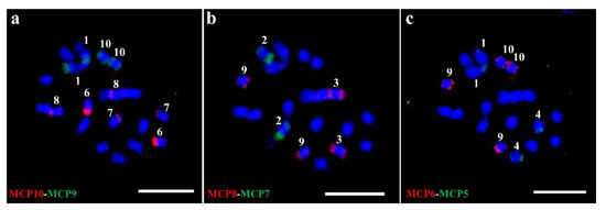 Based on the distributions of the ten MCPs above, we selected six probes, MCP5–MCP10, that were sufficient to distinguish ten sorghum chromosomes in a few rounds of oligo-FISH. These six MCPs were labeled by digoxigenin or biotin, and conjugated with anti-dig or anti-bio antibodies, respectively. Pairs of probes were sequentially hybridized to the same metaphase chromosomes prepared from the root tips of sorghum. For example, MCP9 and MCP10 probes were hybridized to the metaphase cell (Figure 2a). The slide was then washed and re-probed with MCP7 and MCP8 probes (Figure 2b). Finally, all six MCPs probes were applied after three sequential FISH experiments (Figure 2a–c).