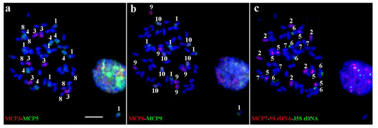 In order to identify the T. arundinaceum chromosomes quickly, we selected seven probes, namely MCP3, MCP5, MCP6, MCP7, MCP9, 5S rDNA, and 35S rDNA. The combined probes could be used to identify T. arundinaceum chromosomes with three rounds of sequential FISH (Figure 4). For example, we used MCP3 (red) and MCP5 (green) probes to identify chromosomes 1, 3, 4, and 8 (Figure 4a). Among them, chromosome 8 produced a weak signal. Then MCP6 (red) and MCP9 (green) were selected to identify chromosomes 1, 9, and 10 (Figure 4b). MCP7 (red), 5S rDNA (red), and 35S rDNA (green) probes were used to classify chromosomes 2, 5, and 6 (Figure 4c). Finally, chromosome 7 was classified by excluding nine nonhomologous chromosomes already identified above.