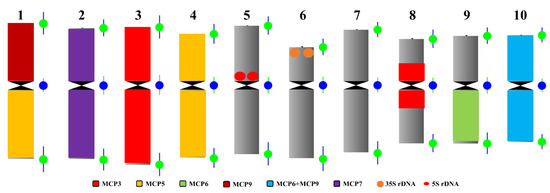 5S and 35S rDNAs were labeled with digoxigenin-11-dUTP or biotin-16-dUTP (Roche Diagnostics, Mannheim, Germany) using a Nick Translation Kit (Roche Diagnostics, Mannheim, Germany). The centromere probe was prepared according to Huang et al. [33]. The So1 probe was used to localize the centromeric region, as it has the highest genome proportion and is located on all chromosomes in sugarcane. MCPs were amplified and labeled according to published protocols [30] using a T7 in vitro transcription method. The first round of FISH was performed as described by Braz et al. [30]. All biotin-labeled (~500 ng) probes were detected by anti-biotin fluorescein (Vector Laboratories, Burlingame, CA, USA) and digoxigenin-labeled probes (~400 ng) were detected by antidigoxigenin rhodamine (Roche Diagnostics, Indianapolis, IN, USA). Chromosomes were counterstained with DAPI (4′, 6-diamidino-2-phenylindole). An AxioScope A1 Imager fluorescent microscope (Carl Zeiss, Gottingen, Germany) was used for capturing images. The final image contrast was processed using Adobe Photoshop 21.0.0 software. Measurement of the short arm and long arm of the individual chromosomes was conducted in the DRAWID software [34]. Arm ratio = the long arm/the short arm; 10 metaphase cells were used for measurement on each chromosome.