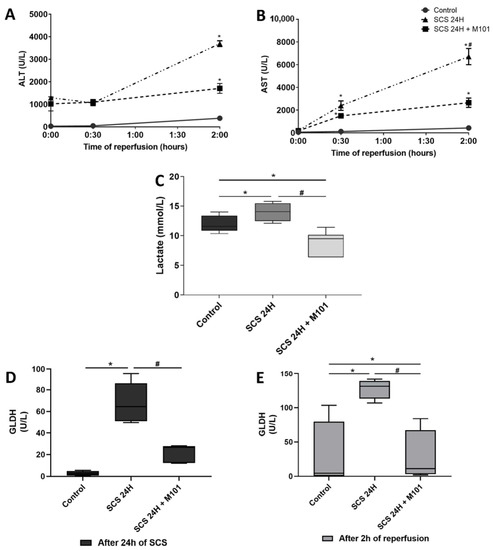 Hepatocellular and mitochondrial injury. (A) Aminotransferase (ALT) and (B) aspartate aminotransferase (AST) release remained lower in the control group than in both other groups during the 2 h of reperfusion. At the end of the reperfusion, transaminases release in the SCS-24H + M101 group was decreased as compared with SCS-24H group. Data are represented as mean (SEM). (C) Lactate levels were significantly lower in the SCS-24H + M101 group than in the control and SCS-24H groups after 2 h of reperfusion. The control group lactate levels were decreased, as compared with the SCS-24H group. (D,E) Glutamate dehydrogenase (GLDH) expression after 24 h of SCS was higher in the SCS-24H group. Following the 2 h of reperfusion, the level of GLDH in the SCS-24H group remained significantly the highest. Data are represented as mean (SD). n = 12/group, * = p < 0.05 vs. control and # = p < 0.05 vs. SCS-24H (Mann–Whitney–Wilcoxon).