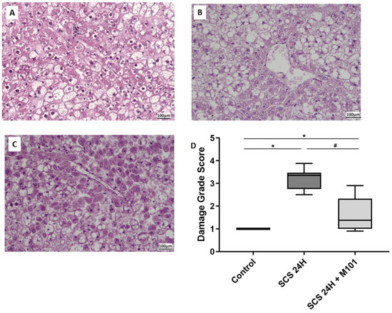 Histological damages reduction with M101. Histology of (A) control group; (B) SCS-24H group; (C) SCS-24H + M101 group. The damage grade score (D) is based on necrosis and coagulation, acute necrosis, disorganization, granular precipitate, sinusoidal dilatation, eosinophilic deposits, number of cells remaining in vessels and inflammation, observed by an expert pathologist. Data are represented as mean (SD). n = 12/group, * = p < 0.05 vs. control and # = p < 0.05 vs. SCS-24H (nonparametric one-way ANOVA (Kruskal–Wallis test)).