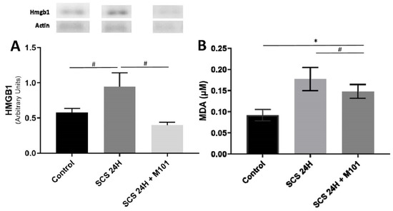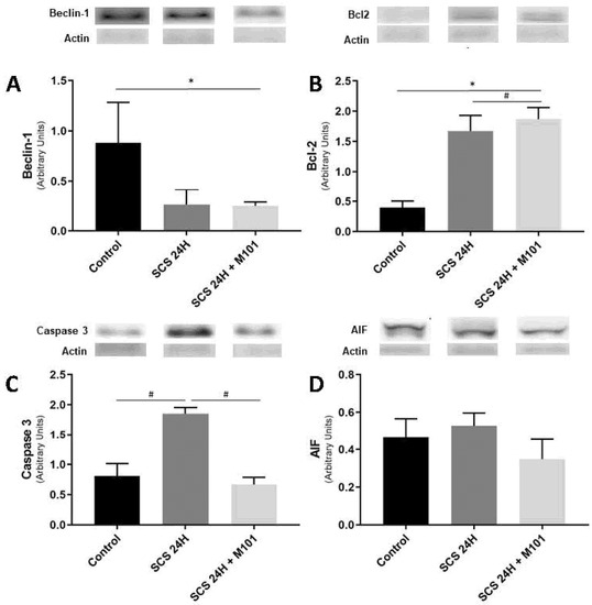 M101 impact on autophagy and apoptosis related marker. (A,B) Beclin-1 significant downregulation and Bcl-2 significant upregulation in the SCS-24H + M101 group seems to be in favor of the activation of autophagy. (C,D) Apoptosis effectors tend to be downregulated in the SCS-24H + M101 group, as compared with the control group and with the SCS-24H group. Data are represented as mean (SEM). n = 12/group, * = p < 0.05 vs. control and # = p < 0.05 vs. SCS-24H (one-way ANOVA).