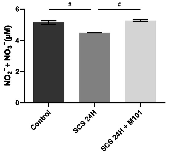 Nitrate/nitrite production decreased in the absence of M101. Nitrate and nitrite production was significantly decreased in the SCS-24H group after the 2 h reperfusion. Data are represented as mean (SEM). n = 12/group, # = p < 0.05 vs. SCS-24H (Mann–Whitney–Wilcoxon).
