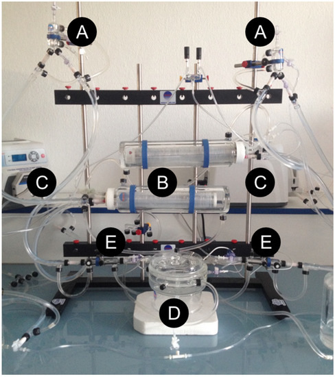 Experimental ex vivo machine perfusion system. Ex vivo machine perfusion system is adapted from liver/kidney systems. (A) Bubble trap. (B) Membrane oxygenating. (D) Liver perfusion chamber (Radnoti LLC, Covina, CA, USA), assembled by the authors (N.A.-F. and A.L.). (C) Peristaltic pump (MasterFlex ®, Thermo Fisher Scientific, Waltham, MA, USA). (E) Flow sensor (TS410 Tubing Module, Transonic Systems Inc., Ithaca, NY, USA), a water bath circulator pump (9102A12E, 6 L High-Stability Digital Controller Refrigerated/Heated Circulating Bath, Polyscience, Niles, IL, USA) and an oxygen bottle (95% O2/5% CO2, Air Liquide, Paris, France).