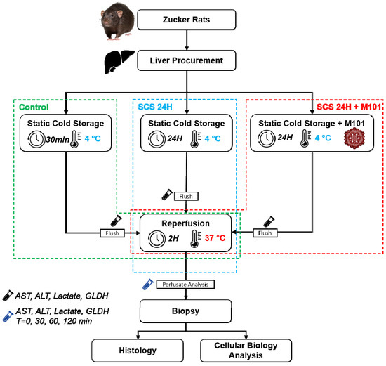 A total of 36 animals were randomly assigned to the following 3 experimental groups: (1) control group (n = 12 livers), immediately perfused in the ex vivo system at 37 °C for direct evaluation; (2) SCS-24H group (n = 12 livers), preserved for 24 h in preservation solution (PS) under static cold storage (SCS) alone before 2 h of normothermia machine perfusion (NMP) evaluation at 37 °C, as the current gold standard; (3) SCS-24H + M101 group (n = 12), where the PS was supplemented with M101 and the livers were preserved and evaluated using the same procedure as the former group (Figure 2). Perfusate and tissue samples were taken during and after the experiments, frozen in liquid nitrogen and kept at −80 °C for further analysis (Figure 7).