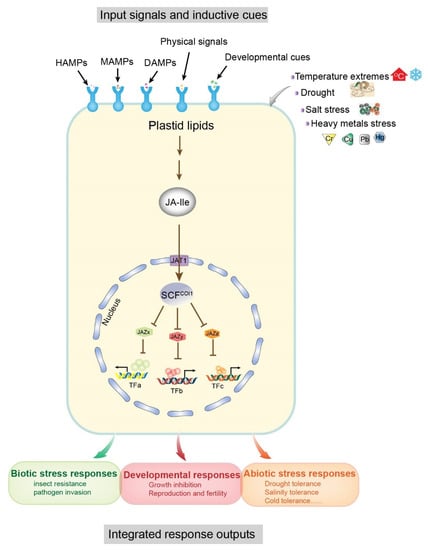 Some molecular models of plant–environment interactions include microbe-associated molecular patterns (MAMPs), herbivore-associated molecular patterns (HAMPs), and damage-associated molecular patterns (DAMPs), which are mainly derived from attacking organisms, cell damage, and abiotic stresses (e.g., salt, drought, heavy metals, cold, etc.) (Figure 1) [,]. In general, these molecular patterns are associated with JA signaling pathways. The receptor-active conjugated complex JA-Ile is a core component of JA signaling pathways [,,]. As inducing signals, environmental stimuli are recognized by cell surface receptors, triggering de novo synthesis of JA-Ile from plastid lipids, which ultimately results in downstream transcription factor interactions and promotion of growth, development, and specific protective mechanisms in plants []. In this reaction, JA-Ile acts to facilitate the interaction between jasmonate zinc-finger inflorescence meristem (JAZ) and coronatine insensitive 1 (COI1) protein within the Skp1p–cullin–F-box protein (SCF) complex, and promotes degradation of JAZ proteins (JAZx, JAZy, and JAZz), resulting in the activation of JAZ-interacting transcription factors (TFs: TFa, TFb, TFc) (Figure 1). These TFs regulate the expression of numerous genes in response to both biotic (e.g., herbivores and fungi) and abiotic (e.g., salt, drought, heavy metals, and cold) stresses and promote specific protection mechanisms (Figure 1) [,,,]. Therefore, JAs are functionally significant and have attracted extensive research interest in the field of plant–environment interactions.