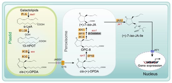 Biosynthesis of JA/JA-Ile initiated by the release of α-linolenic acid from galactolipid. De novo synthesis of JA occurs in the plastids, peroxisomes, and cytoplasm, and JA-Ile is then transported to the nucleus for gene expression. Major genes are indicated in red and enzyme names are highlighted in orange. Abbreviations for compounds: α-LeA, α-linolenic acid; 13-HPOT, (13S)-hydroperoxyoctadecatrienoic acid; cis- (+)-OPDA, cis- (+)-12-oxophytodienoic acid; OPC-8, 3-oxo-2- (2-pentenyl)-cyclopentane-1-octanoic acid; (+)-7-iso-JA, jasmonic acid; (+)-7-iso-JA-Ile, jasmonic acid isoleucine conjugate. Abbreviations for enzymes/proteins: PLA1, phospholipase A1; 13-LOX, 13-lipoxygenase; AOS, allene oxide synthase; AOC, allene oxide cyclase; OPR3, OPDA reductase3; ACX, acyl-CoA oxidase; MFP, multifunctional protein; KAT, 3-ketoacyl-CoA thiolase; JAR1, JA-amino acid synthetase; JASSY, a chloroplast outer membrane protein; CTS, an ABC transporter of the peroxisomal membrane; JAT1, jasmonate transporter 1 (Redrawn based on []).