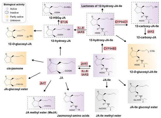 Major jasmonates arising from the metabolic conversion of JA. JA can be methylated to form JA-Me (MeJA) or JA glucosyl ester, decarboxylated to cis-jasmone, or hydroxylated to 12-OH-JA. 12-OH-JA can be sulfated and O-glucosylated, and conjugated with amino acids, preferring isoleucine, which results in JA-Ile. JA-Ile is methylated to JA-Me-Ile. Moreover, 12-hydroxylation of JA-Ile, carboxylation of 12-OH-JA-Ile, O-glucosylation of JA-Ile, and JA-Ile glucosyl ester formation are also possible. Known enzymes involved in these transformations are highlighted in red. Biologically active compounds are in purple and inactive compounds are indicated with dotted outlines in purple. Partially active compounds are shown in yellow, and unknown compounds in gray. Abbreviations: JA, jasmonic acid; JA-Ile, jasmonyl isoleucine; JMT, JA methyltransferase; JAR1, jasmonoyl isoleucine synthetase; CYP94B3, JA-Ile-12-hydroxylase; CYP94C1, 12-OH-JA-Ile carboxylase; the amidohydrolases IAR3 and ILL6; JMT, JA methyltransferase; ST2A, 12-OH-JA sulfotransferase (Redrawn based on []).