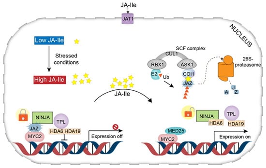 Under stress conditions, JA-Ile accumulates at high levels in the cytosol and is transferred to the nucleus across the plasma and nuclear membrane through the action of JA transfer proteins (AtJAT1/AtABCG16) []. This step is considered the beginning of the JA signaling pathway. In the nucleus, the SCF complex [kinetochore protein 1 (SKP1)-cullin 1 (CUL1)-F-box] mediates JA responses and serves as an E3 ubiquitin ligase. First, JA-Ile transported to the nucleus is recognized by the F-box protein COI1 within the SCF complex. The COI1–JAZ co-receptor complex perceives JA-Ile, promoting the interaction of JAZ with COI1 [,]. This interaction leads to the degradation (ubiquitination) of JAZs in the 26S proteasome (Figure 3). Consequently, the lack of JAZ protein (repressor degradation) results in transcriptional activation of TFs and activation of JA-responsive gene expression [,]. In addition, mediator 25 (MED25), also designated phytochrome and flowering time 1 (PFT1), a subunit of the Arabidopsis mediator complex, connects the TF with RNA polymerase II, modulating gene transcription [,,] (Figure 4).