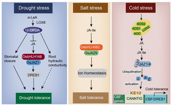 Jasmonic acid (JA)-mediated drought, salt, and cold stress responses in plants. Under drought, salt, and cold stresses, the JA signaling pathway can be activated. When Oryza sativa encounters drought, expression of OsDREB1 is induced. The interaction of OsbHLH148 with OsJAZ1, along with JA-mediated root hydraulic conductivity and stomatal closure, improves drought tolerance in rice. Induced by the stimulus of salt stress, OsbHLH062 interacts with OsJAZ9, resulting in ion homeostasis and improved salt tolerance. In A. thaliana, cold stress induces the expression of AOS1, AOS2, AOC, and LOX2, which cause JA-Ile epimerization from JA. Furthermore, JA-Ile facilitates the interaction of JAZ with the F-box protein COI1 through ubiquitination to regulate the expression of downstream genes, thereby achieving cold tolerance. Abbreviations: 12-OPDA, 12-oxophytodienoic acid; JA, jasmonic acid; bHLH148, basic helix-loop-helix 148; JAZ, jasmonate zim domain protein; DREB, dehydration-responsive-element-binding; LOX6, 13-lipxoxygenase 6; JA-Ile, jasmonic acid isoleucine; AOS, allene oxide synthase; AOC, allene oxide cyclase; CBF, C repeat binding factor; ICE, inducer of CBF expression; COI1, coronatine insensitive 1. (Redrawn based on []).