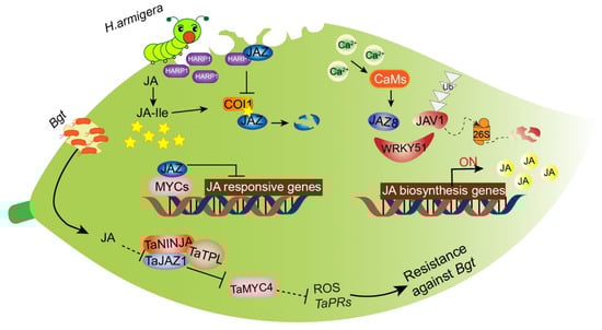 Bread wheat (Triticum aestivum L.) often suffers from powdery mildew, caused by the biotrophic fungal pathogen Blumeria graminis f. sp. tritici (Bgt), whereas transgenic bread wheat lines overexpressing the TaJAZ1 fragment lacking the Jas motif exhibited enhanced expression of the pathogenesis-related genes TaPR1/2 to protect against Bgt. Meanwhile, a co-repressor complex comprised of TaJAZ1, TaNINJA, and TaTPL was found to inhibit the transcriptional activity of TaMYC4 as a result of the degradation of TaJAZ1 []. Overexpression of the JA-related OsbHLH034 gene in rice induced the JA-hypersensitive phenotype and increased resistance to rice bacterial blight []. GhJAZ2 interacted with GhbHLH171 to restrain the JA-mediated defense response to the fungus Verticillium dahliae in cotton []. JAZ8 repressed the transcriptional function of WRKY75, whereas JAZ8 overexpression repressed plant defense responses to necrotrophic pathogens in Arabidopsis []. These results demonstrate that resistance against necrotrophic pathogens can be strengthened by JA signaling-related genes (Figure 7).