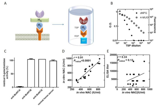 TSP-RSP binding assay. (A) Botulinum neurotoxin A consists of three domains: the receptor binding domain (HC fragment), the translocation domain (HN fragment), and the catalytic domain (LC). The toxin binds to the membrane protein receptor SV2C on neural cells. The TSP-RSP binding assay makes use of two chimeric proteins, RSP adsorbed to 96-well plates and the bound TSP detected by measuring beta-galactosidase activity. (B) TSP was serially diluted and incubated with an RSP-coated 96-well plate. Bound TSP was detected by development with either the chromogenic substrate oNPG or the fluorogenic substrate 4-MUG. By using a fluorogenic substrate, the TSP-RSP binding assay enables the detection of a low TSP concentration equivalent on a molar basis to approximately 6 times the LD50/mL. (C) Prevention of TSP-RSP binding by BoNT/A antitoxin. TSP was incubated with horse anti-BoNT/A, anti-BoNT/B, or anti-BoNT/E antibodies or naïve serum, and then the mixtures were transferred to 96-well plates coated with RSP. Following incubation and washing to remove unbound TSP, the bound TSP was detected by addition of the substrate oNPG. Horse anti-BoNT/B, anti-BoNT/E and naïve horse serum did not reduce TSP binding to RSP, while horse anti-BoNT/A reduced the amount of bound TSP by 97.5%. (D) The in vitro TSP-RSP binding assay exhibited a high correlation with the in vivo mouse neutralization assay. The neutralizing antibody concentration (NAC) of 20 plasma samples was determined using the pharmacopoeial mouse neutralization assay and the in vitro TSP-RSP binding assay. High correlation was obtained between the two methods. On the other hand, the correlation between the neutralizing antibody concentration determined using the pharmacopoeial mouse neutralization assay and the ELISA titers of the samples was poor (E).