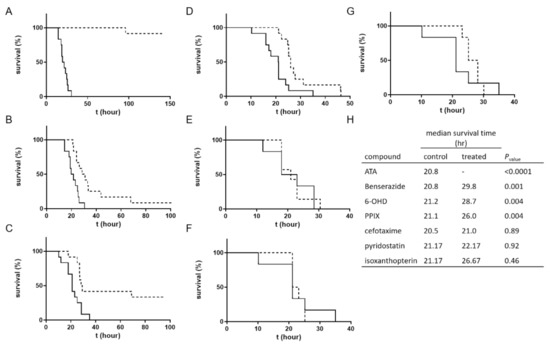 Therapeutic effects of hit compounds in a mouse model. Mice (n = 6) were administered a toxin dose of 4 times the LD50 and then administered the test compound followed by survival monitoring. The survival curves of the treated animals (dashed lines) were compared to those of a control group injected with solvent (solid lines). Compound doses were (A) ATA, 3.125 mg/mouse; (B) benserazide, 12.5 mg/mouse; (C) 6-OHD, 2.5 mg/mouse; (D) PPIX, 1 mg/mouse; (E) cefotaxime, 20 mg/mouse; (F) pyridostatin, 1 mg/mouse, and (G) isoxanthopterin, 4 mg/mouse. (H) Comparison of the survival curves was conducted with the log-rank (Mantel–Cox) test. Significant beneficial therapeutic effects were observed for ATA, benserazide, 6-OHD, and PPIX over solvent in two independent experiments.