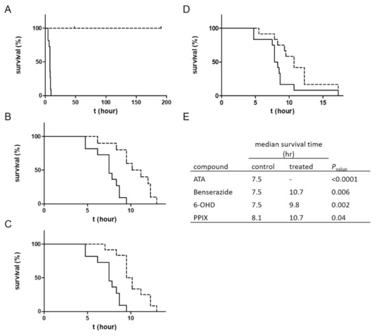 Four of the examined compounds exhibited significant therapeutic effects. Eleven of the twelve (91.6%) mice treated with ATA were fully protected, and the death of the nonsurviving animal was delayed from a median survival time of 20.75 h in the control group to 96 h (p-value < 0.0001). For benserazide, the median survival time was significantly delayed from 20.8 h in the control group to 29.8 h in the treated group (p-value = 0.0011). Four animals in the 6-OHD-treated group survived the challenge (33%), and the median survival time for the nonsurviving animals was delayed from 21.2 h in the control group to 28.7 h (p-value = 0.004). A significant delay was also obtained in the TTD of the PPIX-treated mice (delayed from 21.1 h in the control group to 26.0 h in the treated group) (p-value = 0.004). The compounds cefotaxime, pyridostatin, and isoxanthopterin did not exert beneficial therapeutic effects on the treated animals.