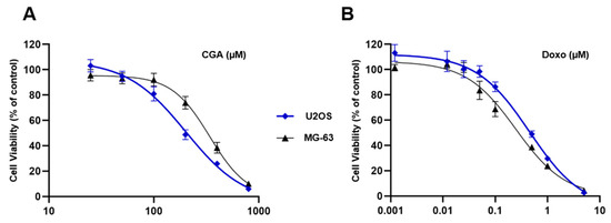 Figure 1. Evaluation of CGA and Doxo-mediated effects in OS cells. U2OS and MG-63 were treated with increasing concentrations of CGA (from 25 to 800 μM) (A) and Doxo (from 0.001 to 5 μM) (B) for 72 h. Cell viability was estimated by MTT and shown in figure as average rate ± standard deviation (SD) relative to the control of three independent experiments.