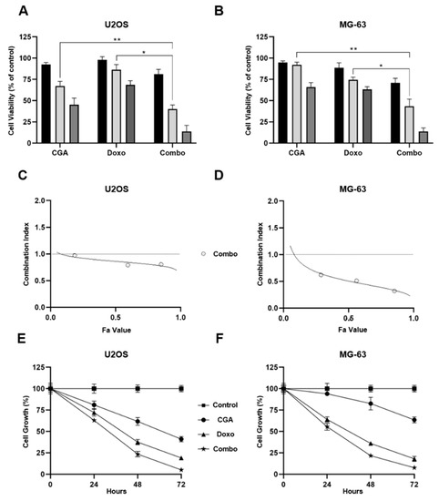 Figure 2. Assessment of CGA, Doxo, and CGA plus Doxo-mediated effects on cell viability and proliferation in OS cells. 100 μM (black bar), 200 μM (light-gray), and 400 μM (gray) of CGA and 0.05 μM (black bar), 0.1 μM (light-gray), and 0.2 μM (gray) of Doxo were administrated individually and together in U2OS (A) and MG-63 (B) for 48 h. Subsequently, cell viability was estimated by MTT assays and shown as mean ± SD in percentage of control. U2OS (C) and MG-63 (D) Fa-CI plots were determined employing CompuSyn software analysis. Representative reports are illustrated in figure. Growth curves at 24, 48, and 72 h were recorded in response to untreated (control), 200 μM CGA, 0.1 μM Doxo, and CGA plus Doxo (combo) in both U2OS (E) and MG-63 (F). Percentage growth values of three distinct biological replicates, expressed as average ± SD, are displayed. * p < 0.05, ** p < 0.01 by an unpaired two-tailed t-test.