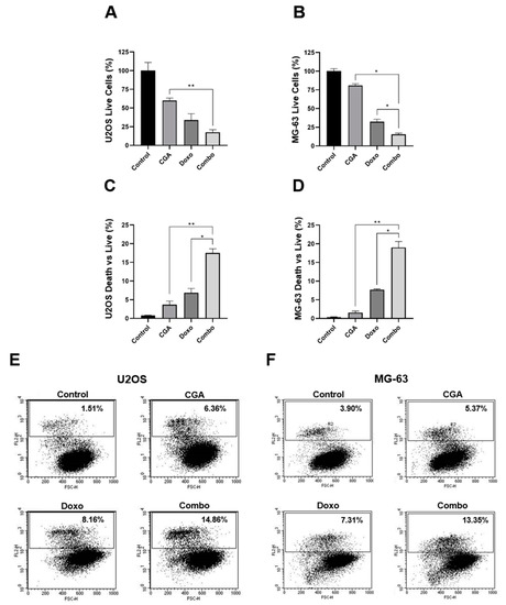 Figure 4. Investigation of CGA, Doxo, and CGA plus Doxo induced cell death in OS cells. U2OS and MG-63 were treated and not (control) with 200 μM CGA, 0.1 μM Doxo, and CGA plus Doxo (combo) for 48 h. Subsequently, living and dead cells were discriminated either by Trypan Blue (AD) or by PI assay (E,F). Representative experimental dot-plots are shown in figure. Living cell number, as well as dead vs. live ratio, is expressed in percentage as mean ± SD. * p < 0.05, ** p < 0.01 by an unpaired two-tailed t-test. Experiments shown in the figure were repeated four times.