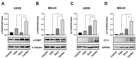 Figure 5. Evaluation of CC-3 and PARP activation in response to CGA, Doxo, and CGA plus Doxo in OS cells. U2OS and MG-63 were exposed and not (control) to 200 μM of CGA, 0.1 μM of Doxo, and CGA plus Doxo (combo) for 48 h. Whole extracts were prepared and then samples were analyzed by Western blotting for PARP (A,B) or CC-3 (C,D) protein levels. GAPDH and α-Tubulin were employed as internal loading controls. Representative Western blotting films were shown in the figure together with the relative densitometric analysis obtained from at least three biological replicates. * p < 0.05, ** p < 0.01 by an unpaired t-test.