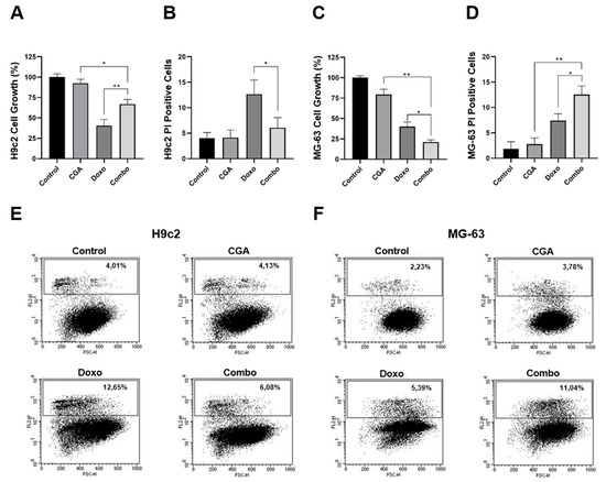Figure 6. Evaluation of CGA, Doxo, and CGA plus Doxo-mediated effect on cell growth and death in H9c2 and MG-63 cells. H9c2 and MG-63 were treated and not (control) with 200 μM CGA, 0.1 μM Doxo, and CGA plus Doxo (combo) for 48 h. Later, the percentage of cell growth (A,C) as well as cell death (B,D) was established. Representative dot-plots are shown in (E,F). * p < 0.05, ** p < 0.01 by an unpaired two-tailed t-test. Experiments were repeated thrice.
