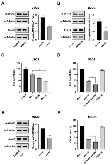 Figure 7. Estimation of MAPK involvement in CGA-mediated Doxo sensitization. U2OS (A) and MG-63 (E) were treated and not (control) with 300 μM CGA plus 0.2 μM Doxo (combo) for 24 h, and then the relative impact on p44/42 MAPK was assessed by Western blotting. (B) Analysis of total and phosphorylated p44/42 MAPK levels following 24 h of exposure to 10 μM PD98059. (C) U2OS were treated and not (control) with 300 μM CGA, 0.2 μM Doxo, and CGA plus Doxo (combo) for 24 h, and then the relative cell number in percentage of control was estimated. Combination treatment impact on U2OS (D) and MG-63 (F) cell growth in an MAPK proficient and hampered background. Three hours pre-treatment with 10 μM of PD98059 preceded and not combo administration. * p < 0.05 by an unpaired two-tailed t-test. Experiments showed in the figure are the end-result of three distinct biological replicates.