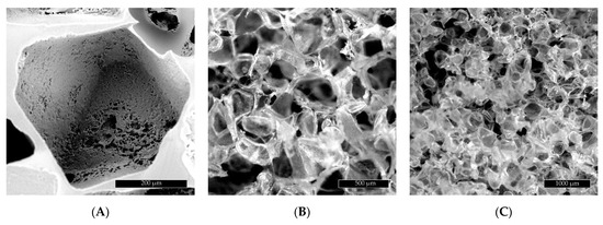 A quantitative analysis of the foams’ internal structure was carried out, including porosity, pore diameter and sphericity. The reconstruction of both foam types and the obtained total porosity (color-coded in terms of size) is shown in Figure 4.