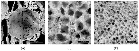 The scaffold structural images obtained by means of SEM and stereoscopic microscopy are shown in Figure 1 (PGS) and Figure 2 (PGS/HAp). A morphological difference between the wall structure can be observed in the images of both specimens. The PGS scaffold walls appear solid, while the addition of hydroxyapatite conceives a shredded appearance of the sample with more empty areas between the pores. The diameter measurement of the pores in Figure 1 and Figure 2 shows an average diameter of 434.1 µm for the PGS scaffold and 483.7 µm for PGS/HAp. These results fit in size the range of the NaCl grains (400–500 µm) used as a porogen in the scaffold manufacturing process.