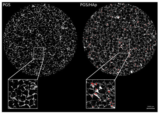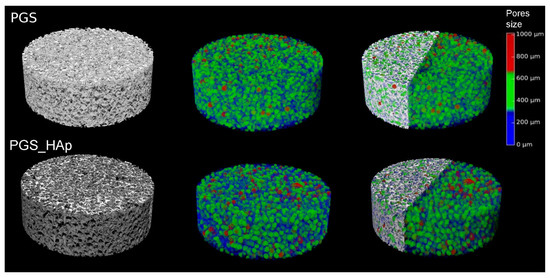 The internal microarchitecture diversity of PGS and PGS foams with hydroxyapatite was defined, i.e., the shape and size of pores and structural arrangement of the materials (Figure 3). Numerous delamination and discontinuities of the structure were visible in the PGS/HAp foams and also noted in SEM images (Figure 2).