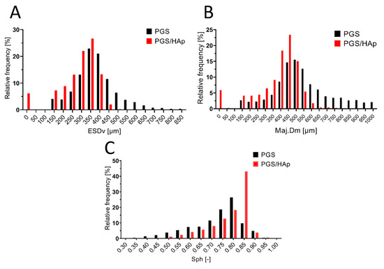 The volume of the Po.V pores was 216.01 mm3 and 193.39 mm3 in the PGS and PGS/HAp samples, respectively. The histogram obtained for the mean ESDv showed that the PGS foam had pores with a diameter ranging from 150 to 850 µm, while, in the case of PSG/HAp, the largest pores had a diameter of 450 µm (Figure 5A). However, in the PGS/HAp foam, small pores localized within the foam wall structure, with a diameter of around 50 µm (or below 75 µm), were observed (Figure 2), and the pore diameter histograms showed their presence at a level of 6% (Figure 5A,B). The mean pore size (ESDv) in the PSG/HAp sample was 286 ± 103 µm, while the major diameter (Maj.Dm) equaled 385 ± 147 µm. When the micropores observed within the walls of this sample were excluded from analysis, this structure was characterized with ESDv equal to 304 ± 77 µm and Maj.Dm equal 410 ± 115 µm. For comparison, in the PSG sample, ESDv values around 383 ± 120 µm and Maj.Dm around 596 ± 271 µm were observed. The pore sphericity (Sph, equal 1 for ideally spherical porosity) analyzed for the PGS and PGS/HAp foams equaled 0.72 ± 0.12 [-] and 0.81 ± 0.05 [-] (p < 0.0001, Mann–Whitney test). The PGS/HAp foam pores were more homogeneous, showing a similar, more spherical shape compared to PGS. For this type of foam, the Sph ranged from 0.35 to 0.90 [-] (Figure 5C). All the parameters are listed in Table 1.