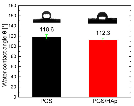 On average, the water contact angle measurement indicated 118.6° ± 4.3 for the PGS scaffolds and 112.3° ± 3.8 for the PGS/HAp scaffolds (Figure 6). The results indicate an increase in hydrophilicity after the addition of Hap, which is consistent with a previously reported study [49]. Multiple articles reported the hydrophilic character of bulk PGS ranging from 32° [16] to around 70–80° [49,50,51]. The porous morphology highly affects the contact angle on the researched scaffolds. Similar water contact angles were achieved (105.23–111.90°) for a study in which porous PGS scaffolds manufactured by the salt-leaching method were investigated [52].