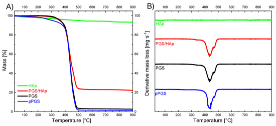 Based on the TGA analysis degradation mechanism, the thermal stability of the pre-polymer pPGS and the foams was determined and the hydroxyapatite content in composite foam PGS/HAp 75/25 was estimated. The TGA curves and the first derivative of the mass with respect to time (dm/dt = f(t)) (dTGA curves) are shown in Figure 7. Thermal stability values estimated as temperature corresponding to 5 wt.% of mass loss (T-5%) are collected in Table 1. The T-5% of crosslinked PGS is about 55 °C higher than that of the prepolymer pPGS. Moreover, due to the rgw presence of HAp, the thermal stability of composite foams was additionally improved by about 7 °C (Table 2).