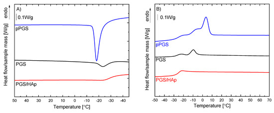 In order to compare the thermal properties of the synthesized pre-polymer pPGS and the porous PGS and PGS/HAp scaffolds, the differential scanning calorimetry measurements were performed. It is known that PGS exhibits a semi-crystalline character [22,53]. The thermal properties were evaluated from the cooling and second heating DSC curves, because the first heating curves are influenced by the different thermal histories of the synthesized pPGS and the PGS and PGS/HAp foams formed by thermally induced phase separation followed by thermal crosslinking and salt leaching. The cooling and second heating DSC curves are presented in Figure 8, and the estimated thermal parameters are collected in Table 3. As indicated by the exothermic peak on the cooling curves of pPGS and PGS, the pre-polymer and polymeric foam crystallized from the melt, whereas the composite foams did not exhibit melt crystallization on cooling with the heating rate used (10 °C/min). Melt crystallization of the composite foam was partially restricted due to the crosslinking of PGS, when comparing between the crystallization behavior of pPGS and PGS. However, the lack of melt crystallization of the composite foam is mainly caused by the high content of HAp particles. Thus, for the composite foam on the cooling curve, only glass transition was visible with the glass transition temperature (Tg) at −28.6 °C. Due to crosslinking, the melt crystallization of PGS shifted to lower temperatures compared to pPGS. The peak temperature of the melt crystallization (Tc) of PGS was lower by about 5.8 °C compared with that of pPGS, and the enthalpy of melt crystallization (ΔHc) of PGS was lower than that of the pre-polymer. The Tg of pPGS and PGS cannot be estimated reliably, because of the overlapping of the melt crystallization exothermic reaction on the glass transition range. However, the presence of a glass transition clearly indicates an increase of the baseline level visible at temperatures below melting, recorded for pPGS. The Tg values evaluated from the second heating DSC curves were −25.1 °C, −25.8 °C and −24.9 °C for pPGS, PGS and PGS/HAp, respectively. Above the glass transition, a melting peak was recorded for pPGS and PGS. The melting peak of PGS was located at 3.3 °C. On the leading edge of the melting peak of pPGS, a second maximum was located, and the main melting peak was at −9.4 °C. The melting enthalpy of pPGS was higher than of PGS, indicating a higher crystallinity degree of pPGS. Concluding, the DSC experiments revealed that the composite foam was amorphous, whereas pPGS and PGS were semicrystalline with a lower crystallinity degree of the PGS foam.